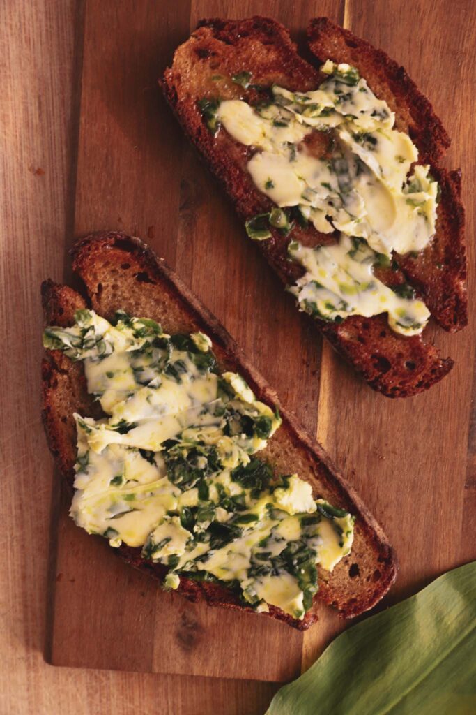 Die Butter sollte Zimmerwarm sein und kann dann mit dem gehackten Bärlauch und Gewürzen nach Wahl vermengt werden.
