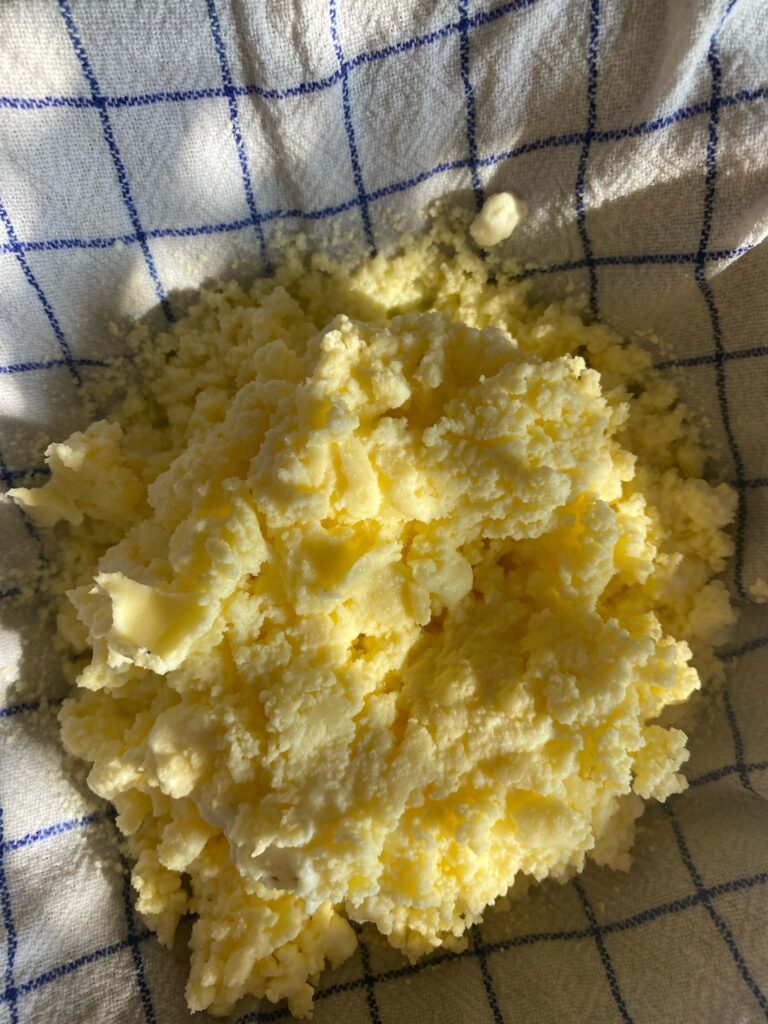 Die Butterklumpen, die entstanden sind müssen dann noch kräftig ausgedrückt werden, am besten durch ein sauberes Küchentuch, um die restliche Buttermilch zu entfernen.